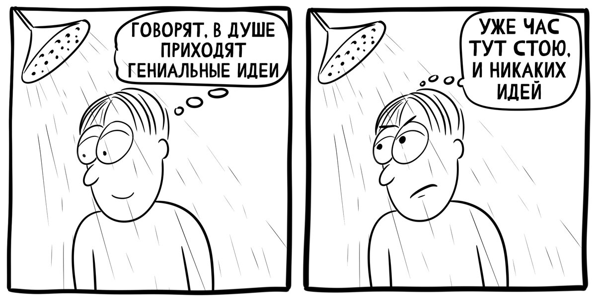 Не раз слышал от творческих людей, что какая-то смелая интересная идея приходила к ним во время принятия душа. Да немало и моих собственных комиксов и шуток для них были придуманы, пока я стоял под тёплой водичкой. В чём же магия этого процесса? Давайте разбираться вместе. Пишите в комментариях своё мнение на этот счёт и рассказывайте, какие идеи приходили в душевой к вам. И, конечно, смотрим комиксы, многие из которых, уверен, были придуманны там же. Работа из серии “How to” мексиканского художника Сантьяго Эспарза как раз хорошо иллюстрирует, откуда в душе берутся все эти мысли и гениальные идеи. Порой душевой мыслительный процесс столь увлекателен, что мы забываем сделать то, собственно зачем мы посещаем душ. Автор TheJinShow Кому-то даже удалось, принимая душ, разобраться с извечным вопрос о своём предназначении. Комикс Джима Бентона Увы, не все мысли в душе бывают гениальными и полезными. Зачастую в голову лезет полная ерунда. Зарисовка от Deya Muniz А бывает, что и вовсе эти мы
