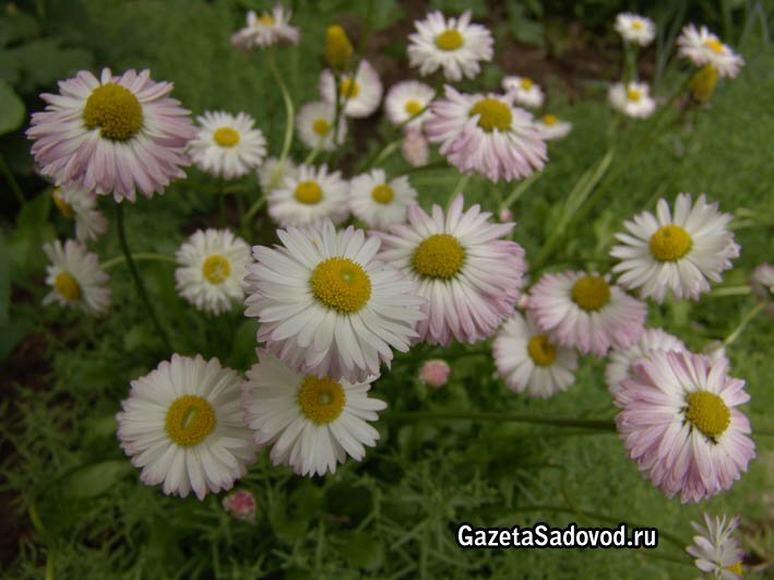 •Сорта: известно множество сортов, отличающихся размером соцветий, окраской и махровостью. Наиболее популярны следующие сорта: Шнеебель – выс. 15-20 см, соцв. чисто-белые, диам. 4-5 см, махровые, цветет в мае – июне; Этна – выс. до 15 см, соцв. 4-5 см диам., красные, с желтым центром, полумахровые; Россе – выс. 15 см, соцв. розово-красные, 4-5 см в диам., махровые; Помпонная – популярный сорт миниатюрных маргариток. В кусте образуется до 40 соцветий диам. 2,5 см. Цветет с апреля по июль.