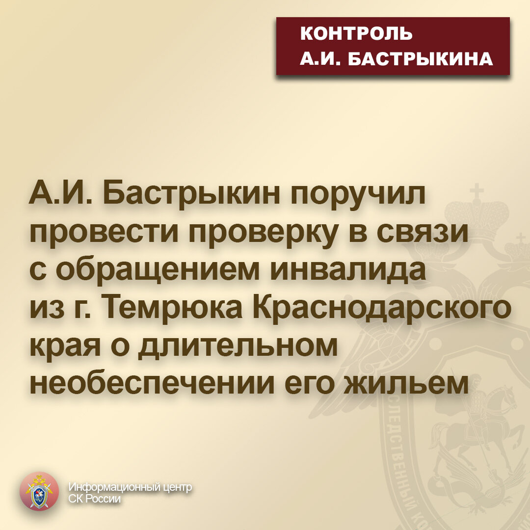 А.И. Бастрыкин поручил провести проверку в связи с обращением инвалида из г. Темрюка Краснодарского края о длительном необеспечении его жильем