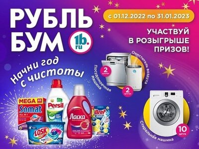 Чтобы принять участие в рекламной акции Начни год с чистоты необходимо с 1. Покупайте товары под товарными знаками «Persil», «Ласка», «Vernel», «LOSK», «E», «Bref», «Somat», «Clin», «Пемолюкс», «К2r» в сети магазинов «Рубль Бум» на сумму от 399 рублей; 2. Регистрируйте покупки на сайте акции https://promo1b.ru/; 3. Участвуйте в розыгрыше призов. Призовой фонд: