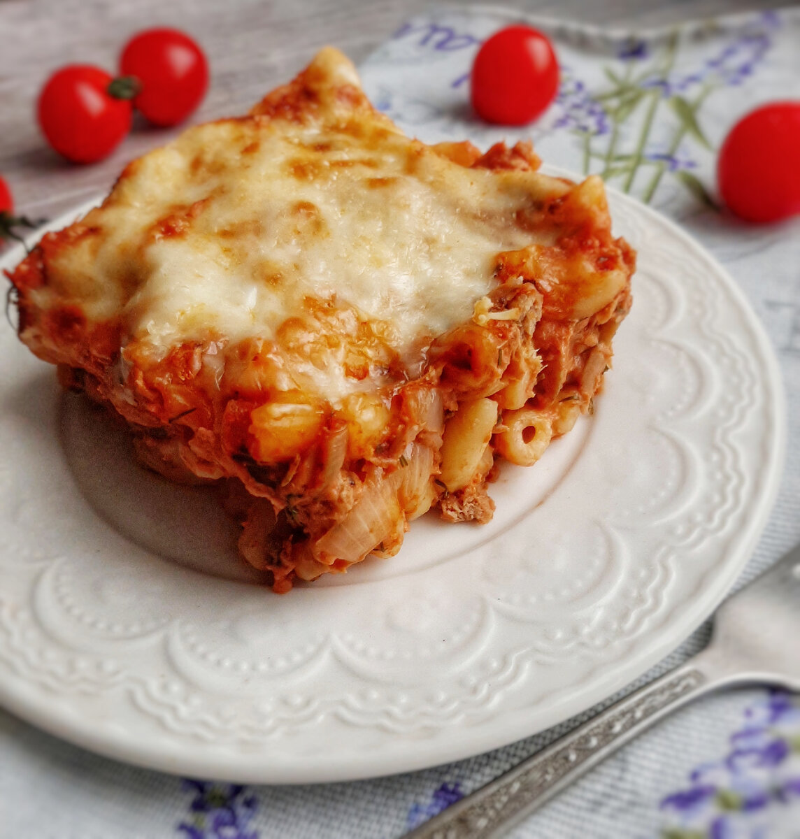🍽КБЖУ на 100 г.: 120 ккал 8.7/4.2/12.2 Выход: 790 г. 🍽Ингредиенты: Макароны (в сухом виде) - 100 г. Лук - 50 г. Долька чеснока. Шампиньоны - 180 г. Тунец в с/с - 150 (Вес без сока). Сметана 15% - 100 г. Томатная паста - 100 г. Сыр лёгкий - 50 г., у меня "Natura" Топлёное масло - 5 г. Орегано - 1 ч.л. Свежая зелень, у меня укроп. Соль, перец. 🍽Приготовление: 1️⃣ Макароны отвариваем в подсоленной воде по инструкции на упаковке. 2️⃣ Лук и чеснок мелко нарезаем. Грибы нарезаем ломтиками. 3️⃣ Сковороду смазываем маслом и обжариваем лук с чесноком до золотистого цвета. 4️⃣ Добавляем грибы, чайную ложку орегано, накрываем крышкой и тушим минут 5. 5️⃣ В отдельной миске смешиваем по 100 г. сметаны и томатной пасты, добавляем соль, перец и перемешиваем. 6️⃣ С тунца сливаем сок и добавляем в сковороду к грибам, перемешиваем. 7️⃣ Добавляем соус, снова перемешиваем, затем отварные макароны и нарезанную зелень. Всё ещё раз хорошенько перемешиваем. 8️⃣ Выкладываем содержимое сковороды в форму