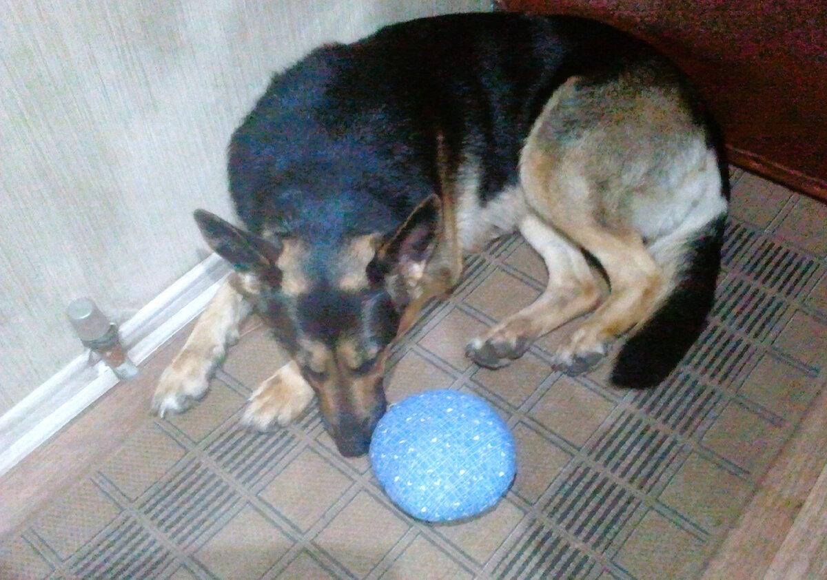 Однажды я купила овчарке Тигре музыкальную подушечку. В секонде среди игрушек отыскала, подумала, что собаке непременно понравится. В подушке внутри был механизм, а снаружи - верёвочка с шариком на конце. Потянуть - играла музыка. Тигра обрадовалась. Мягкие игрушки никогда не рвала и не портила. Схватила очередное подношение в зубы, улеглась на диван, разглядывала, музыку слушала. Через некоторое время надоело мне включать, занялась другими делами. Когда вернулась в комнату, Тигра перегрызла верёвочку. Удивилась я было - что за фокусы новые? Затем сообразила, что видимо, закончилась музыка, собака сама хотела завести. Всё-таки объяснила - так делать нельзя. Связала верёвочку узлом. С тех пор Тигра ничего грызть не пробовала. Просто носила подушечку в зубах, а я включала музыку, собака слушала. Затем попались ещё две похожие подушки. Со временем поломались механизмы, я и выбросила. Недавно разбирала старые игрушки с антресолей и нашла исправную подушку. Показала Кейси, включила мел