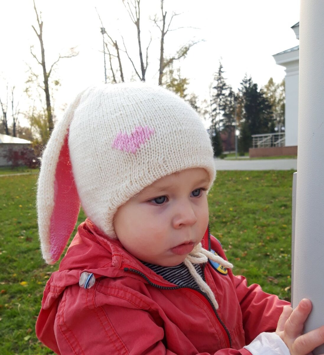 Это её 1,5-годовалая дочь, для которой она хотела самую лучшую шапку с анатомической посадкой, чтобы не испытывать неудобств в её ношении, а малышка находилась бы в комфорте. Помимо этого Татьяна вместо ушек медвежонка (как в оригинале МК шапочки WINNIE) связала заячьи ушки.