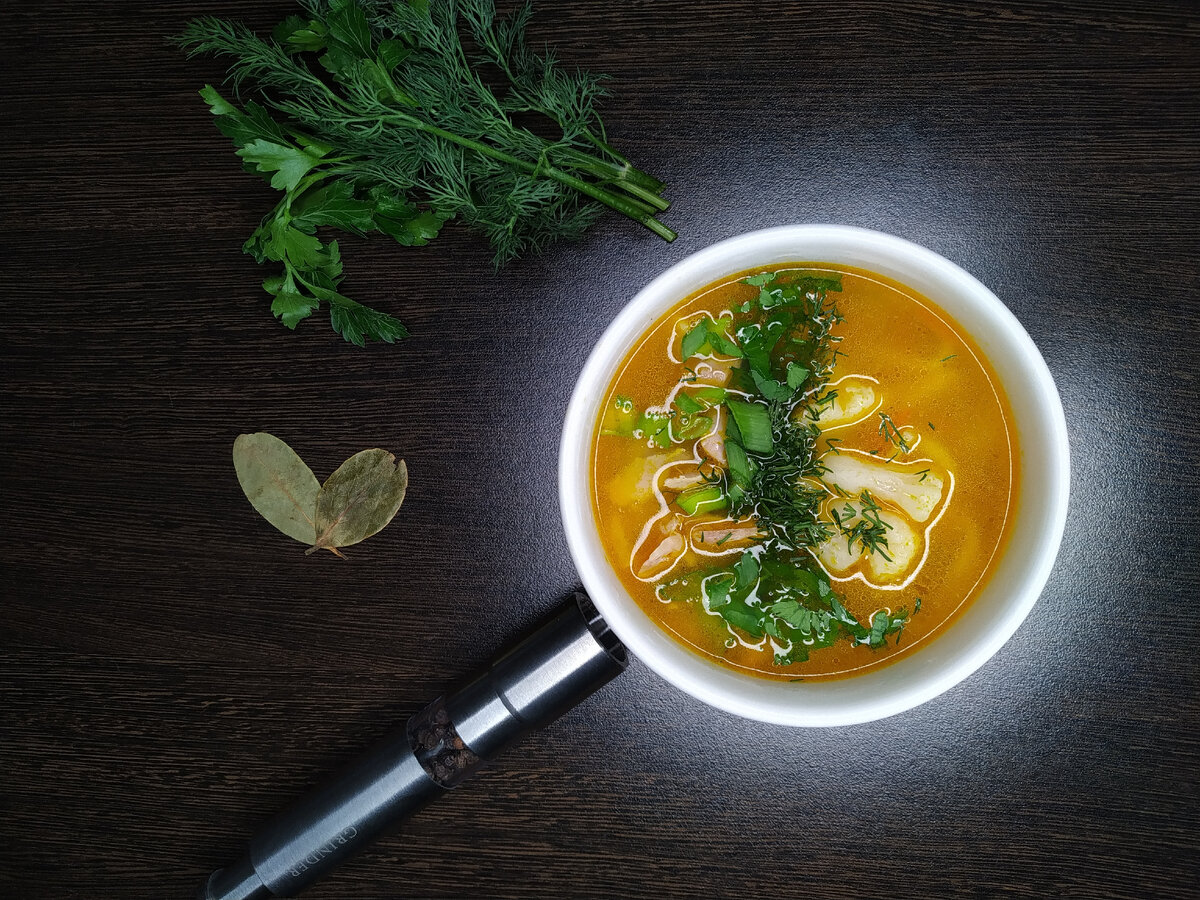- В кастрюлю с водой добавляем куриные ножки (можно использовать другую част курицы на ваш выбор), луковицу ( предварительно разрезав на пополам), 1 морковь, стебель петрушки, укропа, лавровый лист, перец горошком, ставим на плиту, до закипания, убираем пену после закипания и убавляем огонь, готовим на среднем огне 30 минут.