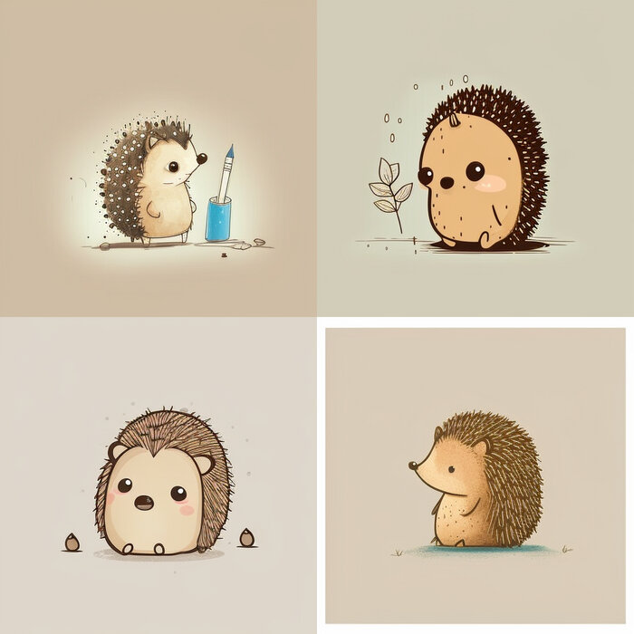 Хочу показать на одном примере, как порой ведется работа над запросами для генераций картинок нейросетью. Сперва была идея изобразить ежика, как бы нарисованного от руки на листе бумаге. Промпт составила такой: little hedgehog, cartoon, illustration, hand drawn, simple minimalistic cartoon drawing, Kid draw. (Маленький ежик, мультфильм, иллюстрация, рисованный от руки, простой минималистичный мультяшный рисунок, детский рисунок) Результат 1: Ежик вполне себе мультяшный, но не хватает ощущения рисунка на листе бумаги. В промпт добавила «лист бумаги»: a small hedgehog drawn by hand, a simple minimalistic cartoon drawing, a children's ink drawing, a drawing on a piece of paper. (Маленький ежик, нарисованный от руки, простой минималистичный мультяшный рисунок, детский рисунок тушью, рисунок на листе бумаги) Результат 2: Захотелось зафиксировать в промпте простой карандаш, как дополнительный объект для взаимодействия с ежиком: a small hand-drawn hedgehog and a real simple pencil, a simple m