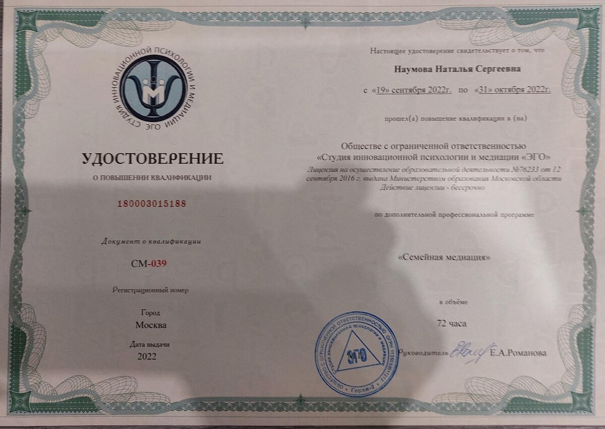 - Так вам ехать или шашечки? Это хорошая иллюстрация принятия решения о выборе того или иного специалиста для оказания услуг, в том числе услуг медиатора. Профессионализм приходит с опытом, чем больше проводишь медиаций, тем больше получаешь эмпирического материала, тем богаче твой профессиональный арсенал, тем не менее, в каждой области медиации есть своя специфика. Например, в семейной медиации затрагиваются интересы детей, иногда дети могут принимать участие в медиации, часто важно сохранение нормальных отношений и возможности спокойного дальнейшего общения, а еще это одна из самых эмоциональных областей. Я из тех людей, которым и шашечки, и ехать, поэтому я прошла повышение квалификации и получила удостоверение семейного медиатора. Это было серьезное погружение на глубину. В самую суть темы: я получила новые знания в работе с
