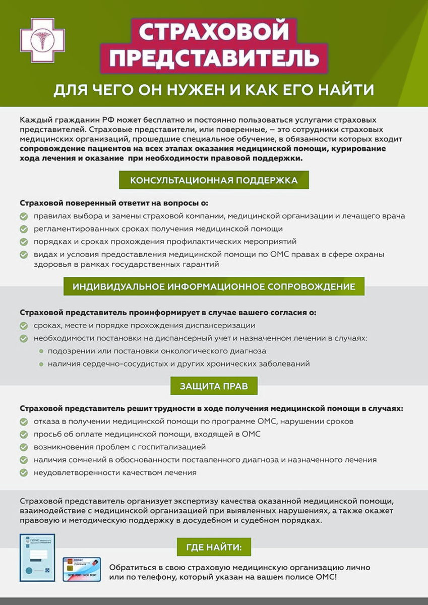 Страховые представители — это сотрудники страховой медицинской организации, специалисты в сфере обязательного медицинского страхования (ОМС). Их главной задачей является защита ваших прав на бесплатную медицинскую помощь по полису ОМС.
