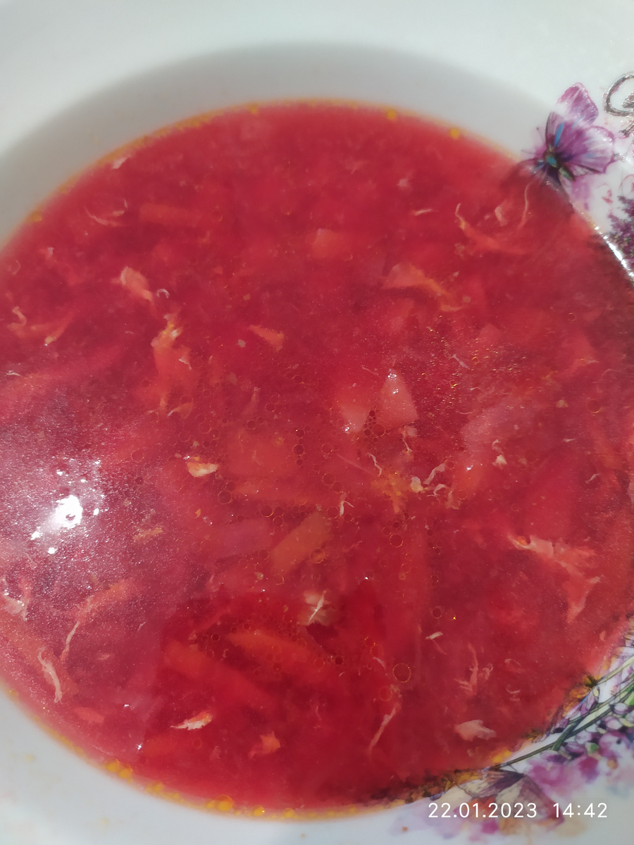 О бульоне читайте тут Я уже рассказывала, что свеклу в борщ мы не добавляем. Из свеклы мы варим свекольник. После того, как сварился бульон, добавляем картофель. Пока варится картофель, делаем зажарку из лука, моркови и свеклы. После того как картофель сварился, отправляем зажарку в кастрюлю. Некотрые добавляют в свекольник уксус, чтоб суп не был сладковатым от свеклы. Мы варим свекольник без уксуса. Моя мама добавляет в свекольник яйцо. Можно отварить и мелко порезать и отправить яйцо в кастрюлю. А можно сырое яйцо взбить в кружке и добавлять тонкой струйкой в кипящий свекольник, быстро размешивая. По такому же принципу мы варим суп "кучерявый". Яйцо в бульоне получается " Кучеряшками". На фото свекольник с кучеряшками из 1 яйца.