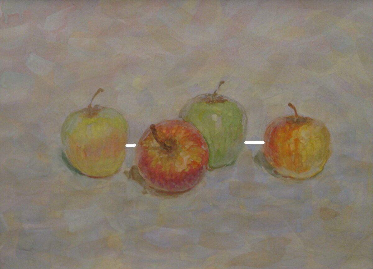 Сразу уточню, что речь идёт о "художественной", станковой композиции - натюрморта, пейзажа, многофигурной. Так как у композиции декоративной (орнамента) свои законы. Ритм в композиции – закономерность чередования элементов и их групп и интервалов между этими элементами (группами). Так вот в декоративном орнаменте - это, как правило, чередование "одинаковостей" через одинаковые интервалы, а в художественной композиции - чередование "разностей", то есть группы элементов не должны повторяться, и между элементами или их группами не должно быть одинакового расстояния. Я бы отнесла к ритму чередование объектов по массе: большой-маленький-средний, по тону – светлый-тёмный-светлый, по цвету; также расположение по принципу «выше-ниже»: элементы не должны попадать на одну линию по горизонтали. Хорошо учиться ритму, например, создавая композицию из нескольких яблок или груш, примерно десятка. Двигая их влево-вправо, вверх-вниз, соединять их в группы и находить интервалы, чтобы композиция была инт