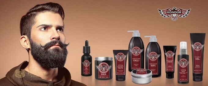 KONDOR — российский бренд уходовой и стайлинговой косметики, принадлежащий фирме Астория. Компания появилась в середине 90-х и распространяла продукцию итальянских марок. В 2011 году она запустила собственное производство, пересмотрела линейку средств. Косметику отличает запах — не всегда брутальный, но обязательно мужской. В ассортименте Кондор представлены шампуни, средства для стайлинга, гели для бритья, препараты для ухода за бородой. Примечательная особенность формул — минимальный расход и высокая результативность. Они нашли применение в барбешопах и салонах красоты. Товары разделены на три серии: Hair&Body, MyBeard и ReStyle. Первая линейка Hair&Body предназначена для ухода за волосами и телом. Основу формул KONDOR составляют натуральные ингредиенты, в том числе чили, хмель, табак и деготь. Эффективность целебных растений подтверждена исследованиями. Экстракт чили освежает, хмель нормализует функционирование сальных желез, мята тонизирует. Дополняют серию косметики мыла ручной р