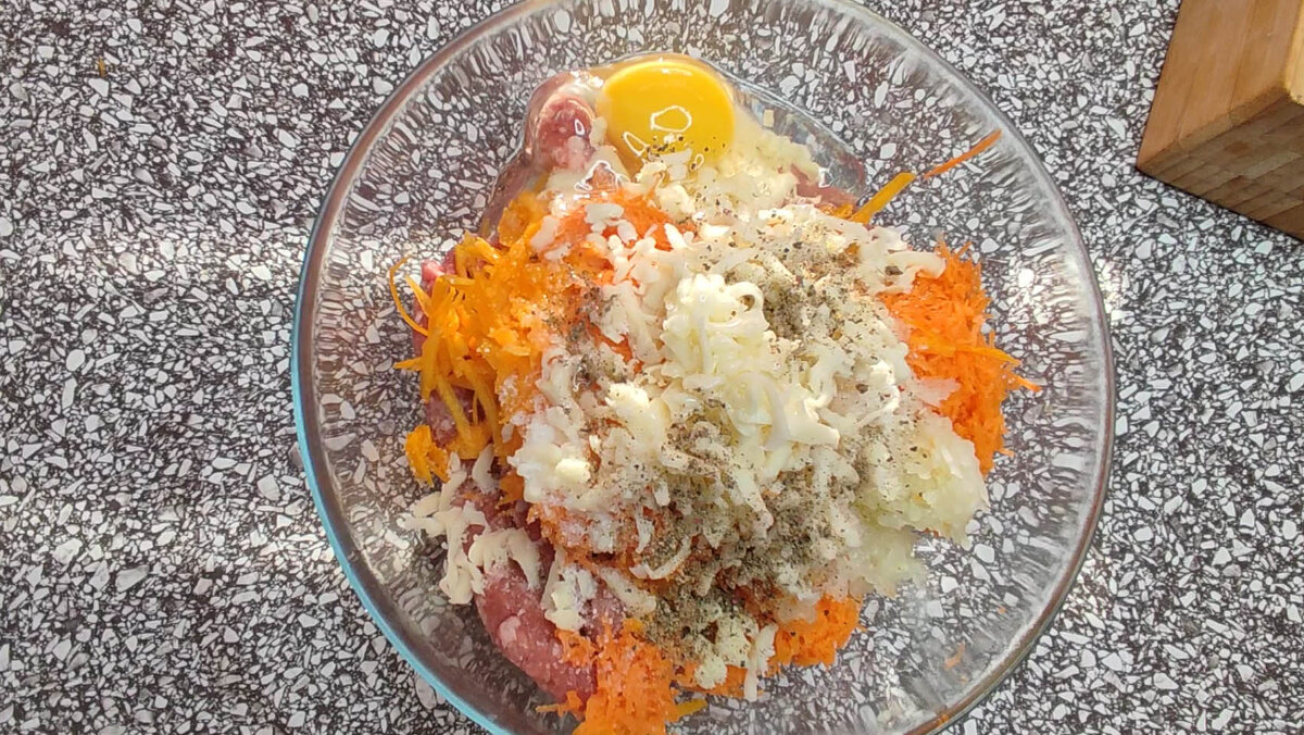 ✅ В одной миске смешиваю 600 гр. фарша, одну большую луковицу, 200 гр. тыквы, одну небольшую морковь, большую дольку чеснока, небольшой кусочек (70 гр.) мягкого сыра типа сулугуни.