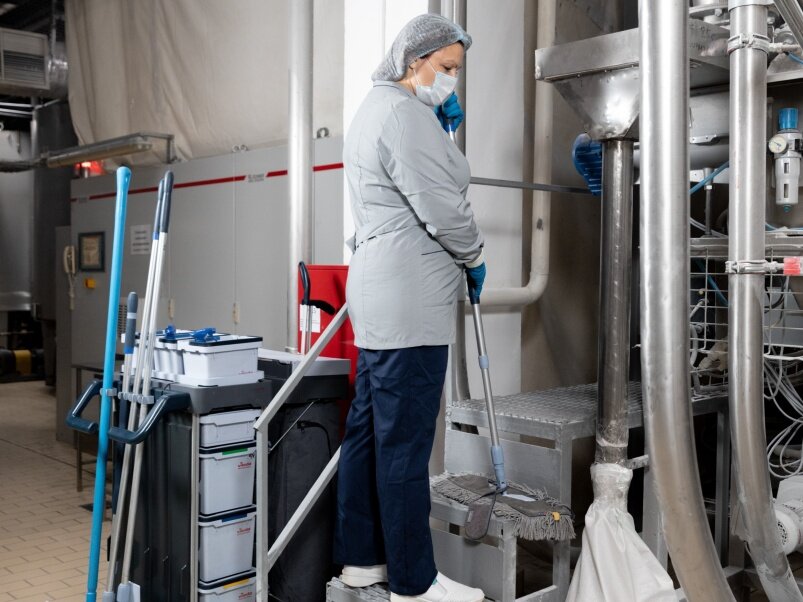 - В процессе уборки производства занято большое количество сотрудников, закрепленных за конкретными цехами, которые постоянно очищают, собирают, моют, дезинфицируют (при необходимости) рабочие поверхности и оборудование.
