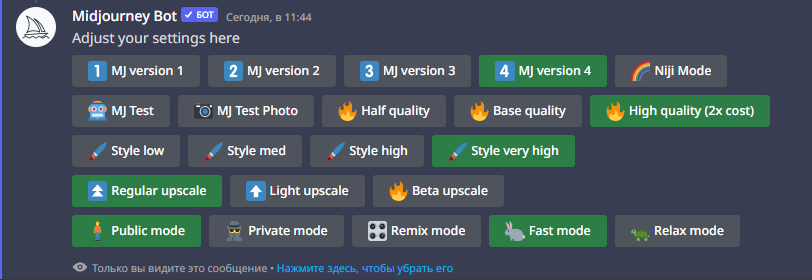 /Settings - это команда, которая вызывает меню базовых настроек. Я постараюсь вкратце рассказать что за что отвечает. 1. Версия движка. Можно выбрать старые если вам нужно. Помимо 4 стандартных версий самой Midjourney, теперь появился новый мод - Niji Mode - эта опция позволит вам создавать картинки в стиле аниме.Для сравнения: в режиме Niji Mode В стандартном режиме MJ version 4 Тоже самое на примере человеческого изображения: 2. MJ Test — это два экспериментальных изображения вместо четырёх Как оказалось, на данный момент работает только с Base Quality, со стилизацией не выше Style Med MJ Test Photo - режим фотореализма. работает с теми же условиями, что и MJ Test и еще одна попытка - (также выдает только 2 варианта) 3. Уровни качества генерации | Half quality |
