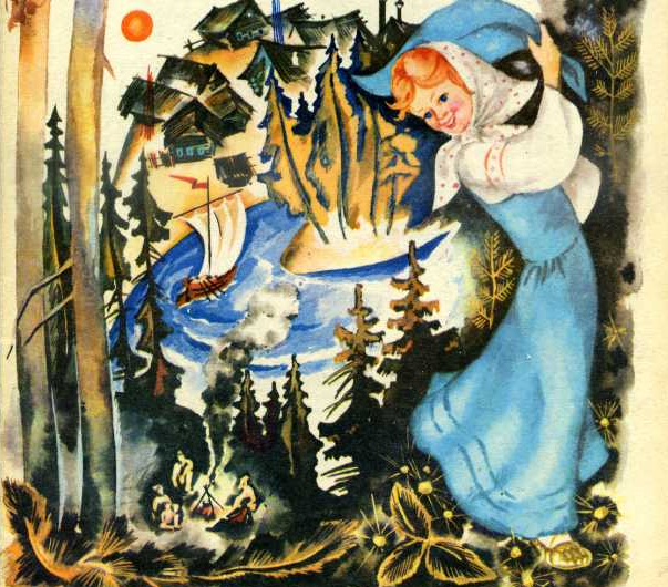 У П. П. Бажова немало лиричных, прекрасных сказов. И самым иллюстрируемым был, пожалуй, "Серебряное копытце". А мы покажем сегодня иллюстрации к другому сказу - об Огневушке-поскакушке. И покажем нашу игрушку по его мотивам. Это издание вышло в "Малыше" в 1977 году - обычная тоненькая книжечка с иллюстрациями Т. Морковкиной. Уральская природа - суровая, красивая. На фоне огромных камней и вековых деревьев люди кажутся крохами. Часто Огневушку изображают в красном сарафане, но у Бажова есть описание ее внешности и одежды. А вот и дед Ефим с мальчиком Федюнькой. Сцены жизни, уже утраченной, но еще узнаваемой - запряженная в сани лошадь, женщина с коромыслом. А вот и встреча Федюньки с Огневушкой. Очень красиво и - хочется сказать - достоверно изображен волшебный танец Огневушки-поскакушки, способный превратить зиму в лето. А вот и наша игрушка, вдохновленная Бажовым и его замечательными сказочными образами. Всё, как и сказано в тексте - рыжеволосая девушка в синем платье и с голубым пла