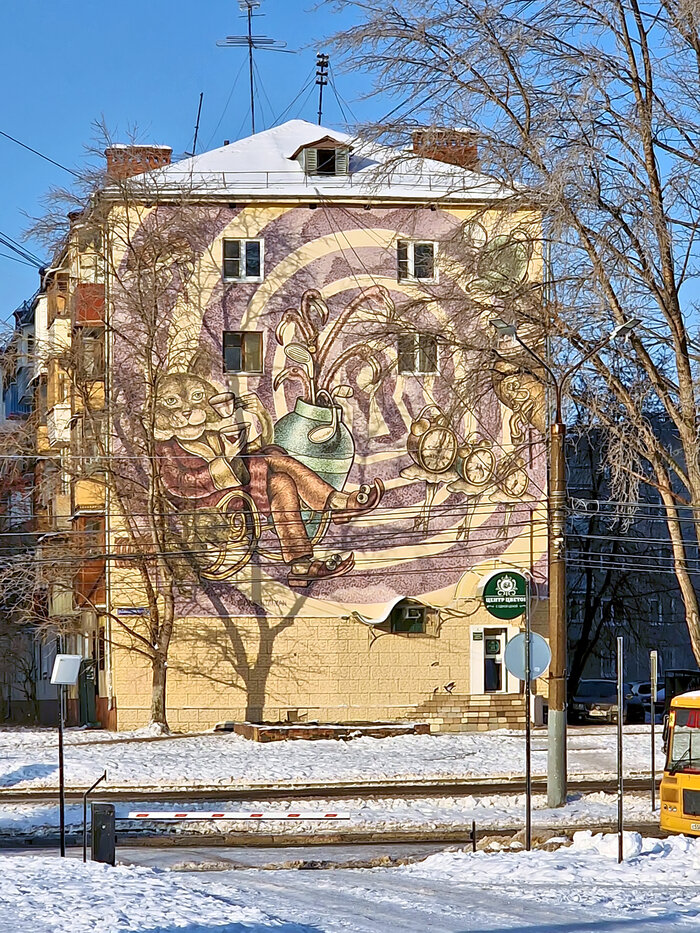 Этот мурал, находящийся чуть позади главного здания Нижегородской Ярмарки, летом практически не виден: всё закрывает листва деревьев. И только зимой его можно заметить и попытаться разглядеть. Может, конечно, Сальвадор Дали и покрасочнее изобразил бы, но мне кажется — главная фишка этого мурала в его неброскости. В коте, пьющем чай, есть что-то от Леопольда, и есть отголоски чаепития у Безумного Шляпника. Фламинго вместе с клюшками для гольфа — прямая отсылка к Кэрролу. Не могу уловить к чему танцующие часы, но свою долю сюра они внесли. И что интересно — окна квартир не выглядят чем-то чужеродным. Они прекрасно вписываются в общую картину. Читайте также.