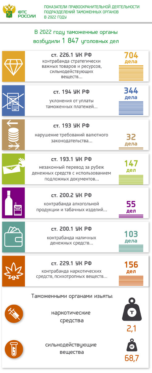 В 2022 году таможенными органами в рамках реализации задач по выявлению и предотвращению угроз экономической безопасности страны возбуждено 1 847 уголовных дел. Предметами преступлений преимущественно являлись лес и лесоматериалы, наркотические средства, психотропные и сильнодействующие вещества, автотранспорт, иностранная валюта и валюта Российской Федерации, товары народного потребления. Наибольшее количество – 704 дела – возбуждено по фактам контрабанды стратегически важных товаров и ресурсов (ст. 226.1 УК РФ). Стоимость незаконно перемещенных через таможенную границу ЕАЭС товаров составила 9,6 млрд рублей. По фактам уклонения от уплаты таможенных платежей (ст. 194 УК РФ), возбуждено 344 уголовных дела, при этом общий размер неуплаченных таможенных платежей составил 6 млрд рублей. По фактам совершения валютных операций по переводу денежных средств в иностранной валюте или валюте Российской Федерации на счета нерезидентов с использованием подложных документов (ст. 193.1 УК РФ) возбуж