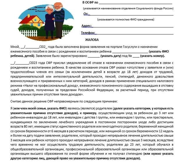 Обжаловать неправомерный отказ можно с помощью подачи жалобы. Отнести жалобу в СФР можно лично, распечатав в 2 экземплярах. Или можно отправить жалобу на официальном сайте СФР — https://social-insurance.sfr.gov.ru/reception_desk/request/ Или можно отправить жалобу на портале Госуслуги — https://do.gosuslugi.ru/. Приводим образец жалобы в СФР из-за отсутствия доходов при наличии уважительных причин. Срок рассмотрения - 30 дней. Документ можно скачать и откорректировать жалобу "под себя", изменив соответствующие данные. Если доходы были хотя бы в одном месяце расчетного периода, нужно это указать.