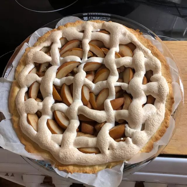 Духовку переключить на 150 градусов. Шаг 5 Белки от двух яиц взбить со 100 граммами сахара. С помощью кулинарного шприца выложить «сетку» на подостывший пирог. Поставить пирог в разогретую до 150 градусов духовку.