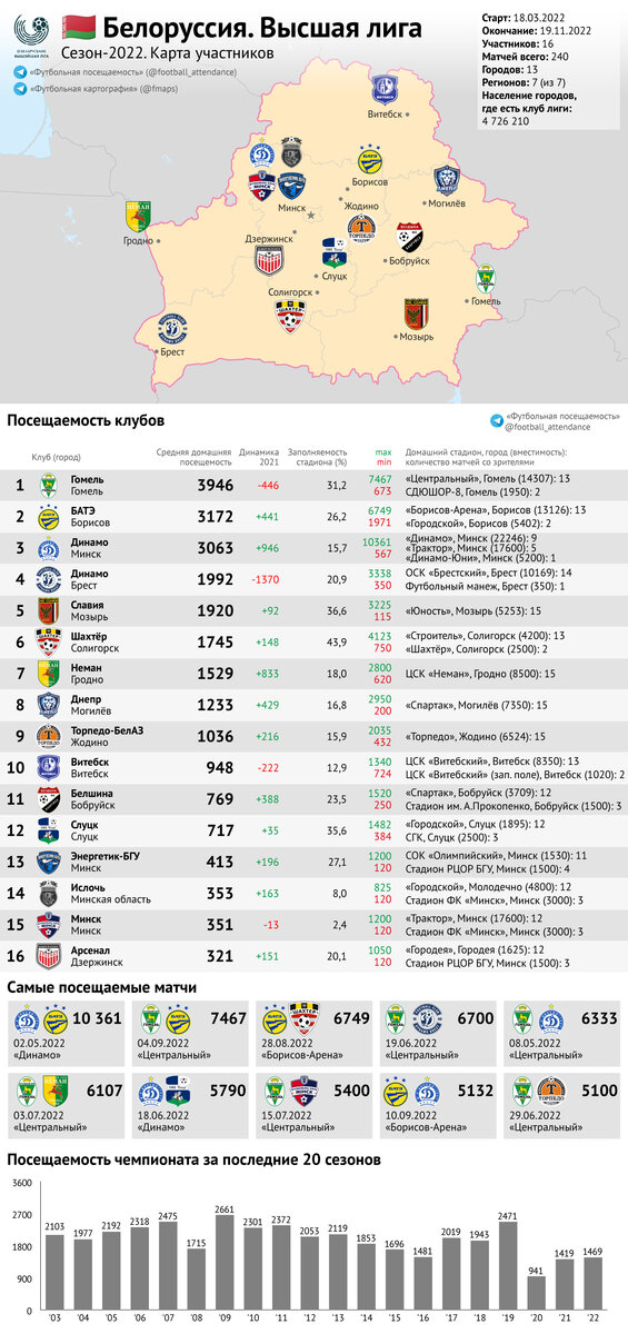 «Гомель» собирал наибольшее число зрителей (3946) на домашних матчах. В тройку лучших также вошли «БАТЭ» (3172) и минское «Динамо» (3063). Ставший чемпионом страны «Шахтёр» по домашней посещаемости только на шестой позиции, но на первой по заполняемости стадиона (43.9%). 10361 зритель — рекордная аудитория для одной игры («Динамо» Мн — «БАТЭ»). Для сравнения ситуации можно прочесть обзор и посмотреть статистику сезона-2019. Не забывайте прочесть и другие материалы: