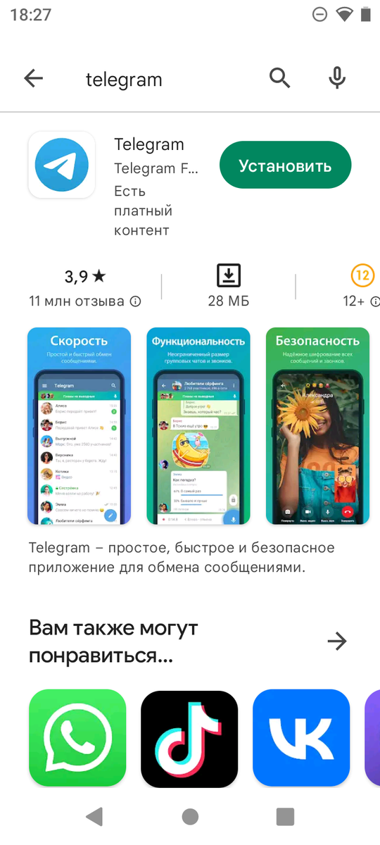Поставить софт на смартфон под управлением Android можно двумя способами — через магазин приложений или загрузив APK-файл. Второй способ крайне не рекомендуется, поскольку чреват заражением устройства вирусами. Лучше всего устанавливать приложения через специальные магазины. Самый популярный — Google Play. Он есть в каждом смартфоне на Android в виде предустановленного приложения. Достаточно ввести данные своей учетной записи, и можно устанавливать нужный софт. Для того чтобы установить из Google Play, нужно написать в поисковой строке название искомого приложения. Можно вводить как полное название, так и использовать ключевые слова. Например, если вы введете фразу «аккумулятор», то вам будет выдан список приложений для работы с батареей. Практика показывает, что немного люди знают о всех нюансах. Поставьте лайк, чтобы об этом узнало как можно больше пользователей. Поставим приложение на примере мессенджера Telegram Вводим его название: Далее нам нужно убедиться в том, что результат со