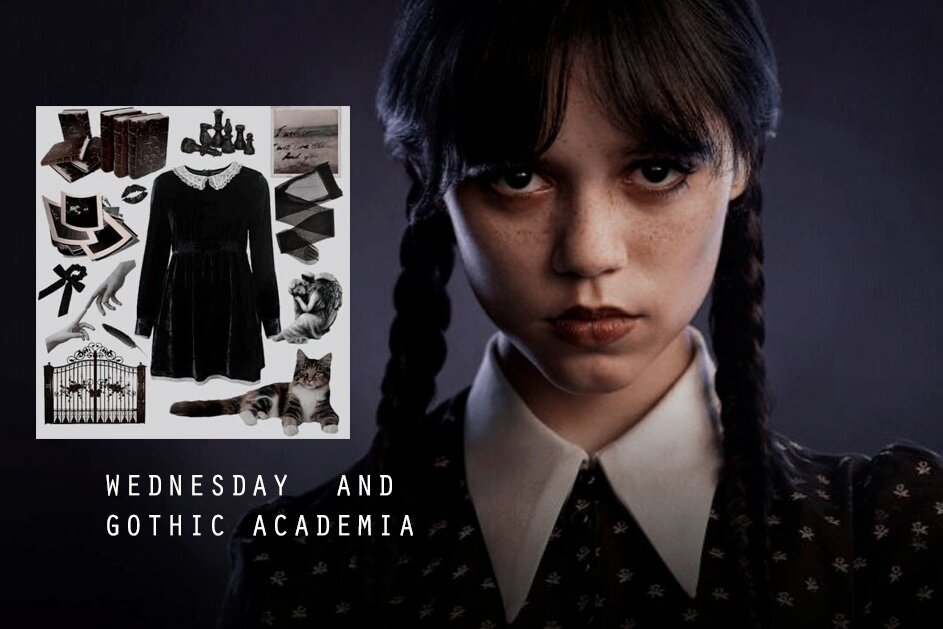 что такое готическая академия? академическая эстетика, в основе которой стремление к самопознанию, страсть к обучению, классическое искусство, но с уходом в готику. Поиск красоты в самых тёмных местах. Близкие эстетические направления — witchy academia и dark academia эстетика: мощенные булыжником переулки, укромные уголки кабинета, окутанные тенями, нависшие грозовые облака над старыми библиотеками символы: мраморные статуи, вороны, луна, мечи, туман, тёмные артефакты стиль: total black, мрачные оттенки (бордовый, глубокий синий, зелёный и коричневый), ботинки Dr Martens, тёмные платья с белым воротником. литература: Мэри Шелли, Эдгар По, Энн Райс, Анна Радклифф, Уильям Фолкнер, Эмили Бронте, Мэтью Грегори Льюис, Брэм Стокер. А теперь перенесёмся в NEVERMORE Основанная в 1791 году, Nevermore Academy — это академическое учреждение, где обучаются так называемые изгои (телепаты, оборотни, вампиры, горгоны и сирены. Самый известный выпусник — Алан Эдгар По По словам художника по костюмам