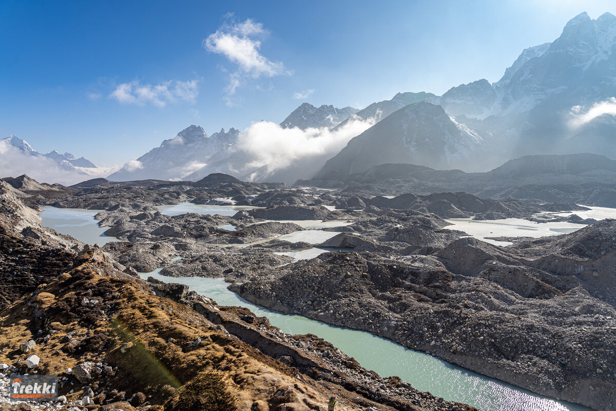 Ледник Нгозумба берет начало от восьмитысячника Чо-Ойю, шестой по высоте горе на земном шаре. Белая гора на фото. Нгозумба считается длиннейшим ледником в Гималаях - он протянулся на 36 километров. Порядка двух часов мне потребовалось чтобы перейти через ледник. Пересекал я его на высотах в районе 4750 м. Ледник живой, всюду хруст, треск, бульканье, летят камни. Так я писал в своих дневниках #непалсоло. В апреле с командой будем снова через него проходить, в этот раз в обратном направлении к перевалу Чо-Ла 5368 м. В предвкушении! #поравлесаивгоры #nepal_trekki #everestbasecamp #базовыйлагерьэверест #ледники #непал #горы