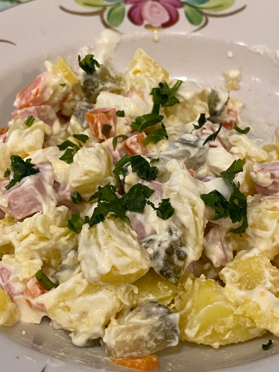 Ингредиенты в конце статьи Шаги: 1) Картофель и морковь сварить, почистить, нарезать мелкими кубиками. 2) Яйца сварить, почистить и натереть на крупной терке. 3) Лук почистить и порезать мелкими кубиками. 4) Колбасу и огурцы порезать мелкими кубиками. 5) Горошек добавляем по желанию, кто любит. 5) Все ингредиенты соединить в миске, заправить майонезом или сметаной. Приятного вам аппетита! Ингредиенты: