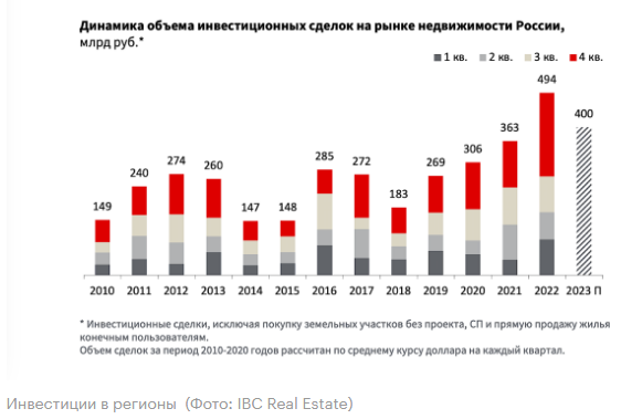 Спрос покупательский снижается, а застройщики начинают тормозить процесс застройки новых территорий, при том, что новых разрешений на строительство к концу года выдано на 26% больше, чем годом ранее (все это на фоне увеличения банка земель под жилищное строительство). В 2022г отмечено снижение объема инвестиций в российскую нежилую недвижимость на 8% в течение года, одновременно с ощутимым ростом вложений под конец года в объекты коммерческой недвижимости (на 35%). Данный рост в большей степени произошел в офисном и складском сегментах (суммарно составляют более 60% в общем объеме инвестирования в коммерческую недвижимость).