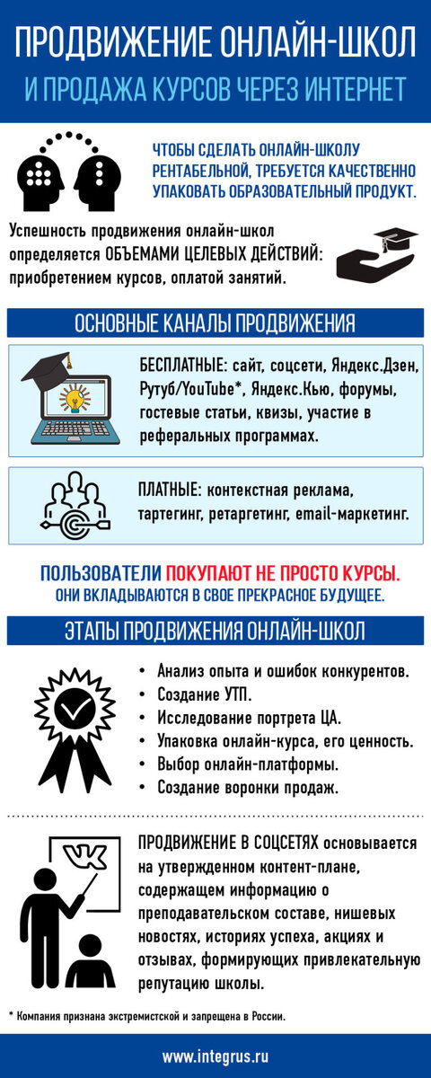 Изменение экономической ситуации и знакомство с дистанционным обучением упростило получение качественных знаний в онлайн-формате. Рост спроса привел к тому, что требования к качеству преподавания и упаковке школ (курсов) возросли. Увеличилась стоимость лида, усложнились ретаргетинг и воронка продаж. Чтобы продвинуть онлайн-курсы в интернете, нужно предлагать высококачественный продукт в конкурентоспособной упаковке. Гарантировать популярность курсов может только качественное обучение и хорошие отзывы. Мониторинг запросов помогает понять востребованность обучающей тематики, а маркетинговая стратегия – планировать развитие онлайн-обучения на перспективу. Как продвинуть онлайн-школу Для качественного и быстрого продвижения следует: Задачей продвижения становится достижение привлекательности целевых действий, например, оплаты обучения или покупки курса. Проверенными каналами являются: Важность упаковки продукта Выбор формата подачи контента влияет на ценность и привлекательность продукта,