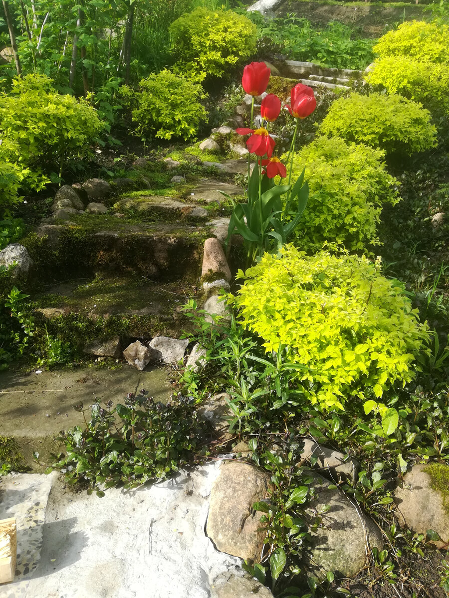 Спиреи, живучка, вербейник монетчатый и мох украшают ее. "Куст" тюльпановый, как брошка, украшает ее весной. Сам растет, ничего не просит. Лесенка заканчивается на середине этого склона перпендикулярной дорожкой, а уже от нее идут боковые лесенки до центральной дорожки склона. Справа уже все сделано, а слева старую я разобрала, новую лесенку еще не сделала. Об этом чуть позже.