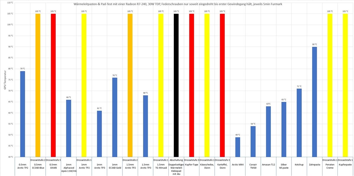Товарищ из комьюнити ComputerBase провел необычное тестирование, в котором использовал в качестве термопасты для охлаждения процессора видеокарты Radeon R7 240 довольно странные материалы. Уточним, что это графика с мощностью всего в 30 Вт, но тесты все равно интересные. В тестировании приняли участие: сыр, детский крем, несколько видов термопрокладок, несколько настоящих термопаст, картошка, кетчуп и зубная паста. Тут-то мы и узнали, что картошка, сыр, большая часть термопрокладок и детский крем не подходят для охлаждения даже 30-ваттного чипа. А вот кетчуп показал результаты, которые сравнимы с настоящими решениями для охлаждения. Уточним, что использовать что-то кроме термопасты для охлаждения крайне не рекомендуется и довольно опасно для "железа", а все описанное выше перечислено исключительно из интереса.