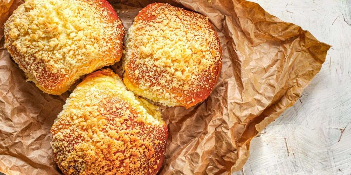 - Булочки смажьте желтком и посыпьте крошкой. Выпекайте 25–35 минут до золотистого цвета.
