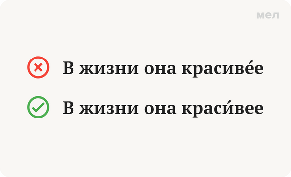 Берём правЕе, становимся сильнЕе, живем веселЕе! Но будем ли мы при этом красивЕе? Или все-таки «красИвее»? Разбираемся раз и навсегда! Правильно: красИвее Почему нас сбивает с толку ударение в слове «красивее»? В словах «левее», «веселее», «сильнее» и многих других подобных ударение падает на предпоследнюю «е». По этому шаблону хочется сказать не только «красивее» — некоторые умудряются поставить ударение на предпоследнюю «е» даже в слове «тщательнее». Но это ошибка! На самом деле «красивее» не слово-исключение. Правило тут такое: для постановки ударения нужно поставить слово в краткую форму женского рода. Получится «красива». Сравнительную степень образуем уже от этого слова и сохраняем ударение — «красивее» (сравните: «весела — веселее», сильна — сильнее»). В превосходной степени, к слову, ударение тоже останется на месте: «красивейший/ая». А комплимент правильно делать так: «Ты становишься красивее», а не «Ты красивеешь» — такой формы просто нет. Ещё больше весёлых и полезных карто