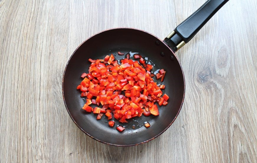 Далее берем болгарский перец и хорошенько его промываем в проточной воде. Удалите плодоножку и семена, а затем мелко нарежьте перец с помощью острого ножа. Старайтесь нарезать перец как можно мельче. Возьмите сковороду подходящего размера и налейте 1 ст л растительного масла. Разогрейте масло на сильном огне и добавьте нарезанный перец. Обжар