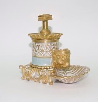 Состоит из трех частей: подставки, тулова и крышки. Тулово украшено жемчужным пояском, а емкость сбоку в виде позолоченной головы льва - для смачивания пера. Подставка: из белого фарфора, покрытого позолотой, крышка из позолоченного металла украшена резьбой. О перьечистке в виде кабанчика мы уже рассказывали, но оставляем ее фото снова - очень она красивая и необычная.