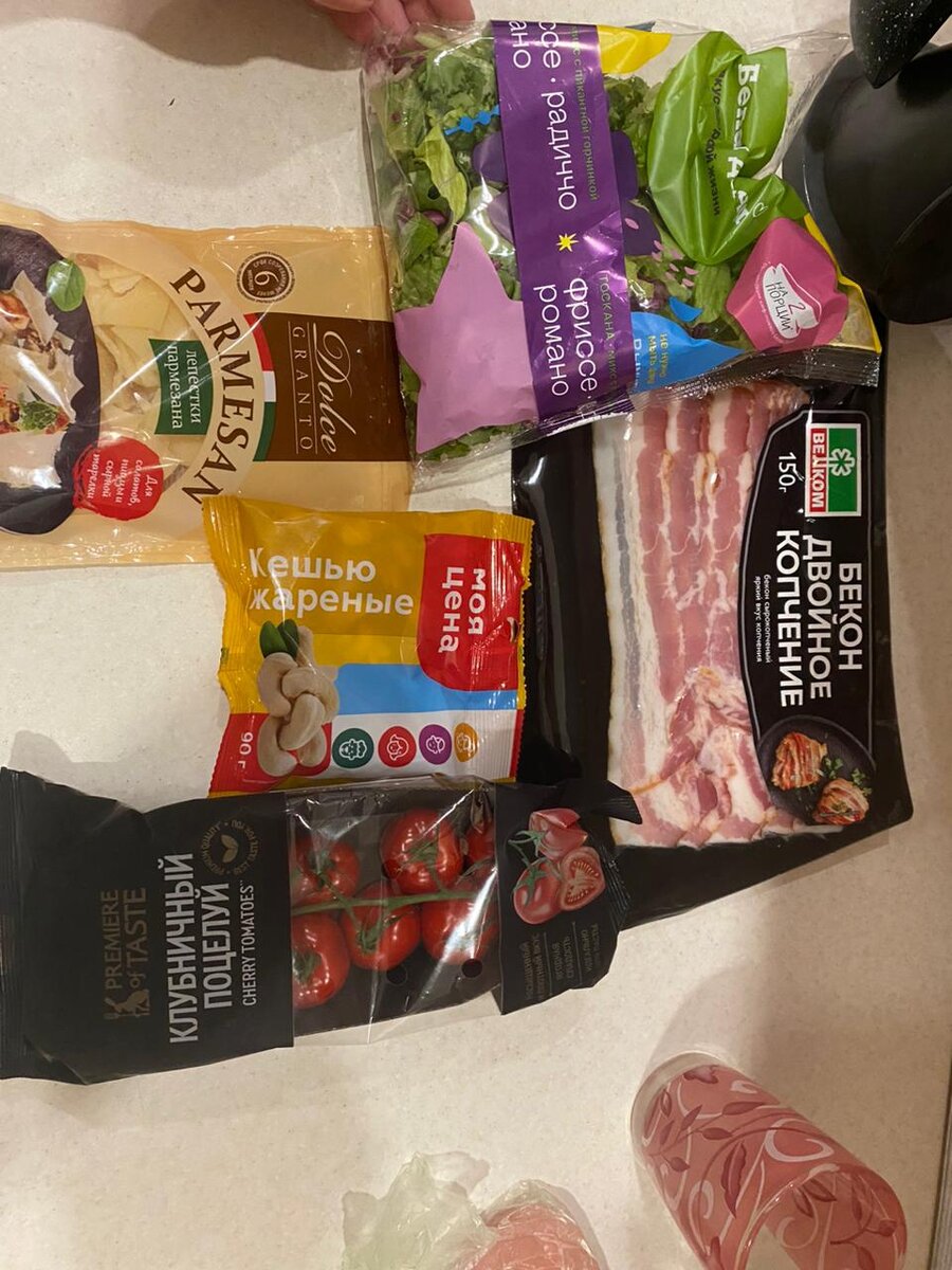 Ингредиенты: Приготовление: Нарезаем бекон на крупные кусочки. Обжариваем бекон на раскалённой сковороде. Нарезаем помидоры Черри дольками. Выкладываем салат в тарелку. Я использую готовый салат, так удобно и быстро. К салату добавляем обжаренный бекон. Добавляем помидоры. Выкладываем орехи. Можно их разломать, чтобы они были меньше. Кстати, кешью можно заменить на кедровый орех. Засыпаем всё пармезаном. Я сразу покупаю нарезанный на тонкие слайсы. Добавляем масло и специи по вкусу. Всё хорошо перемешиваем. Салат готов.