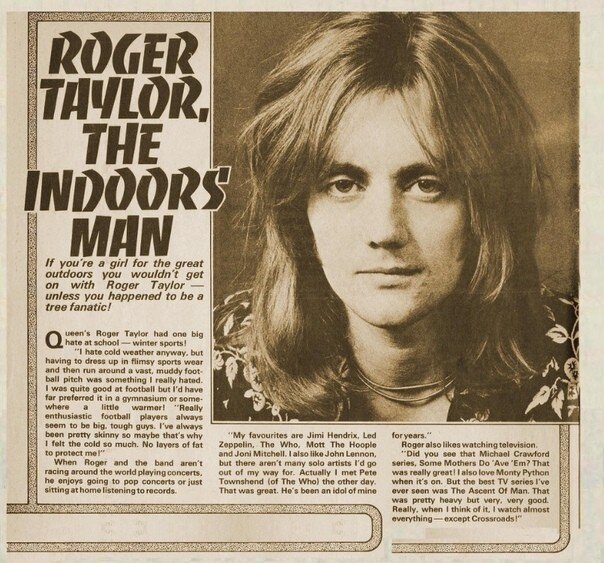 Наверное, все подумали, что бросила Queen. Нет! Я вернусь, просто публикации будут либо пустяковые, крошечные, но частые, либо большие и требующие вложения времени и сил, но редкие. Что лучше, что хуже? Не знаю. Наверное, красота в разнообразии. Итак, Queen возвращается на канал в виде маленькой статейки. Как оно часто бывает с подобными публикациями – неизвестно что, неизвестно откуда, но забавно. Год, наверное, 1973 - потому такие маленькие пустые интервью характерны именно тогда, когда они лишь поднимались к славе. Тут Роджер упоминает Mott The Hoople среди своих любимых групп. Значит ли это, что интервью было дано до совместных гастролей? Итак, Роджер Тейлор, давно не фигурировавший на моем канале. Роджер Тейлор, домосед. Если ты девушка, не любящая засиживаться дома, то ты точно не поладишь с Роджером, - если только случайно не окажешься большой любительницей деревьев! Роджер Тейлор из Queen, будучи школьником, больше всего ненавидел зимние виды спорта! «Ненавижу холодную погоду,