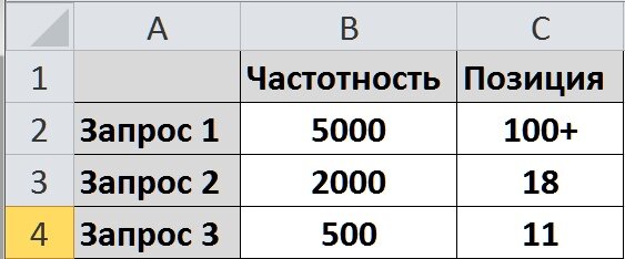 Можно ли считать главным запросом для этого кластера самый частотный запрос, то есть «запрос 1»? В принципе можно, но намного эффективней будет сделать главным запрос, который имеет не самую высокую частотность, зато намного более высокую позицию, ведь куда проще и эффективней сдвинуть запрос с 18-го места в ТОП 3, чем двигать запрос из ниоткуда.