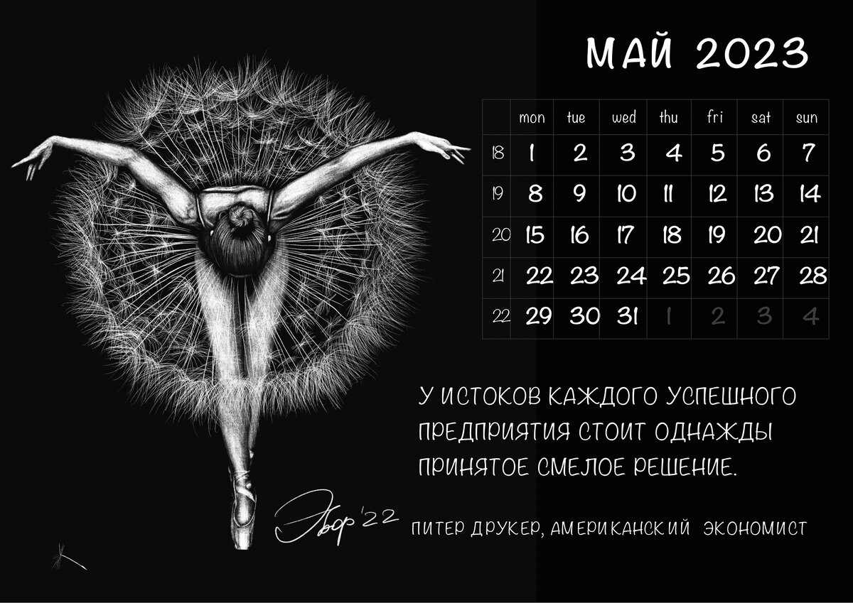#май#календарь2023 #ЧБМай уже почти лето, тем более начались праздники)Лист календаря можно скачать в моем телеграмме (https://t.me/eelfart) до 12.00У ИСТОКОВ КАЖДОГО УСПЕШНОГО ПРЕДПРИЯТИЯ СТОИТ ОДНАЖДЫ ПРИНЯТОЕ СМЕЛОЕ РЕШЕНИЕ.Питер Друкер