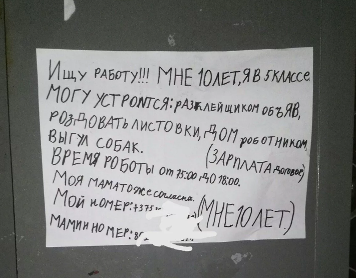 Спросила у своего сына, хотел бы он поработать? Чтобы были свои деньги. Он сказал, смотря что делать, а так конечно. Только ему всего 10 лет, вопрос был чисто риторический. Хотят официально разрешить без согласия родителей работать с 14 лет. Раньше до пандемии, довольно часто видела ребят, раздающих у метро и торговых центров листовки. Им было явно меньше 14 лет. Понять не могу, а какую работу могут выполнять дети в 14 лет? Раздавать листовки, курьерами. Что ещё? Учитывая, что по закону они могут работать не более 4 часов. Или их будут трудоустраивать на какой-нибудь молодежной бирже труда?
