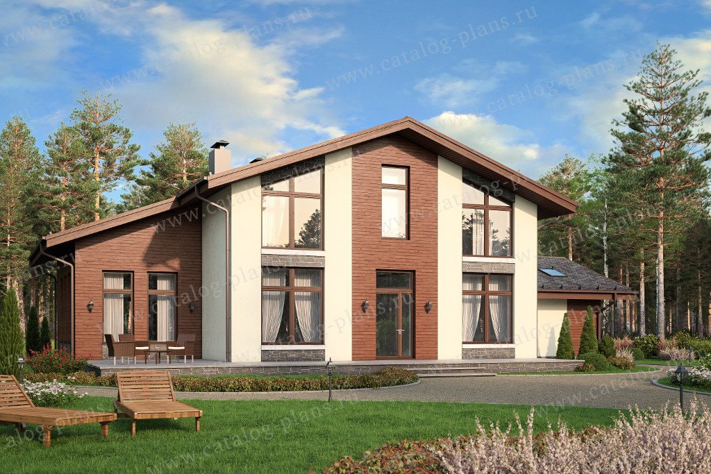 Представляем вашему вниманию проект двухэтажного загородного дома с мансардой. Общая площадь дома составляет 196 квадратных метров. На заднем дворе имеется большая открытая терраса с выходом из гостиной. Фасады из газобетонных блоков отделаны с помощью штукатурки и деревянной доски фирмы Керма. Большие окна визуально облегчают внушительный объем дома. Габаритные размеры 14.6 х 12 метров. В проекте заложены несущие стены и перегородки из газобетона, однако дом может быть выполнен и в других материалах. Рассмотрим подробнее планировки этажей. На первом этаже имеется большая гостиная, столовая, кухня, жилая комната, холл, а так же совмещенный санузел, котельная и тамбур с возможностью размещения в нем гардероба. В гостиной предусмотрен камин, а так же располагается лестница, ведущая на второй этаж. Сама же гостиная запроектирована в двусветном пространстве, а это значит, что здесь всегда будет особенно светло и просторно. На втором этаже разместились две спальни и санузел. Холл здесь пре