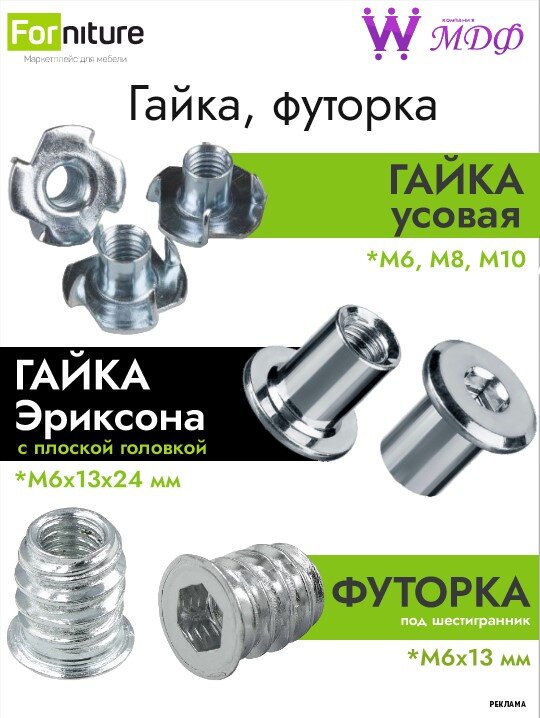 Название этой детали происходит от немецкого Futter, т.е. чехол, подкладка. Футорка - это фитинг, изготавливающийся из латуни. Футорка нашла свое применение в мебели как соединительная деталь для материалов, изготовленных из ДСП, МДФ и различных пород дерева. Вместе с футоркой каталог соединительных деталей для мебели на маркетплейсе Forniture пополнили гайки усовые, гайки Эриксона с плоской головкой.