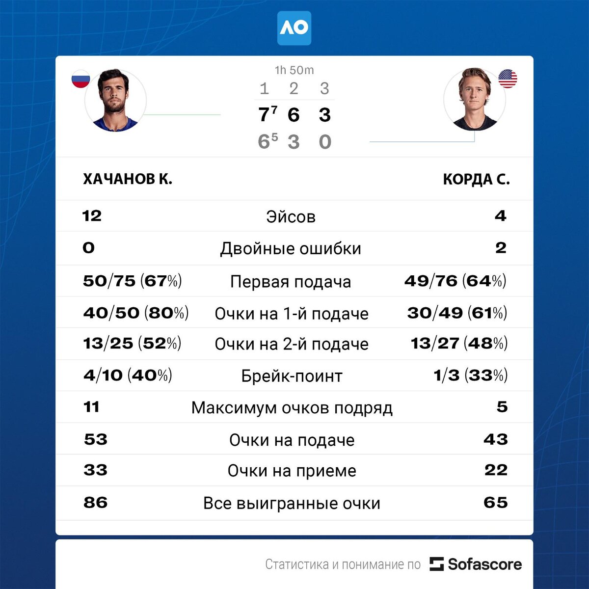 Российский теннисист Карен Хачанов победил американца Себастьяна Корду в четвертьфинале Открытого чемпионата Австралии (Australian Open), проходящего в Мельбурне первого в сезоне турнира «Большого шлема». При счете 7:6 (7:5), 6:3, 3:0 в пользу Хачанова Корда отказался от продолжения матча из-за травмы. Во втором сете американец взял медицинский тайм-аут из-за проблем с запястьем. На турнире Хачанов посеян под 18-м номером, Корда — под 23-м. В третьем круге американец выбил из турнира прошлогоднего финалиста Даниила Медведева. Он сын чемпиона Australian Open-1998 чеха Петера Корды, который спустя полгода после победы был пойман на допинге и дисквалифицирован на 12 месяцев. Россиянин, занимающий 20-ю строчку в мировом рейтинге, ранее никогда не добирался до четвертьфинала на Australian Open. Он лишь раз участвовал в полуфинале турнира «Большого шлема» US Open в прошлом году. В следующей стадии турнира россиянин встретится с победителем пары Стефанос Циципас (Греция, 3) — Иржи Легечка (Че