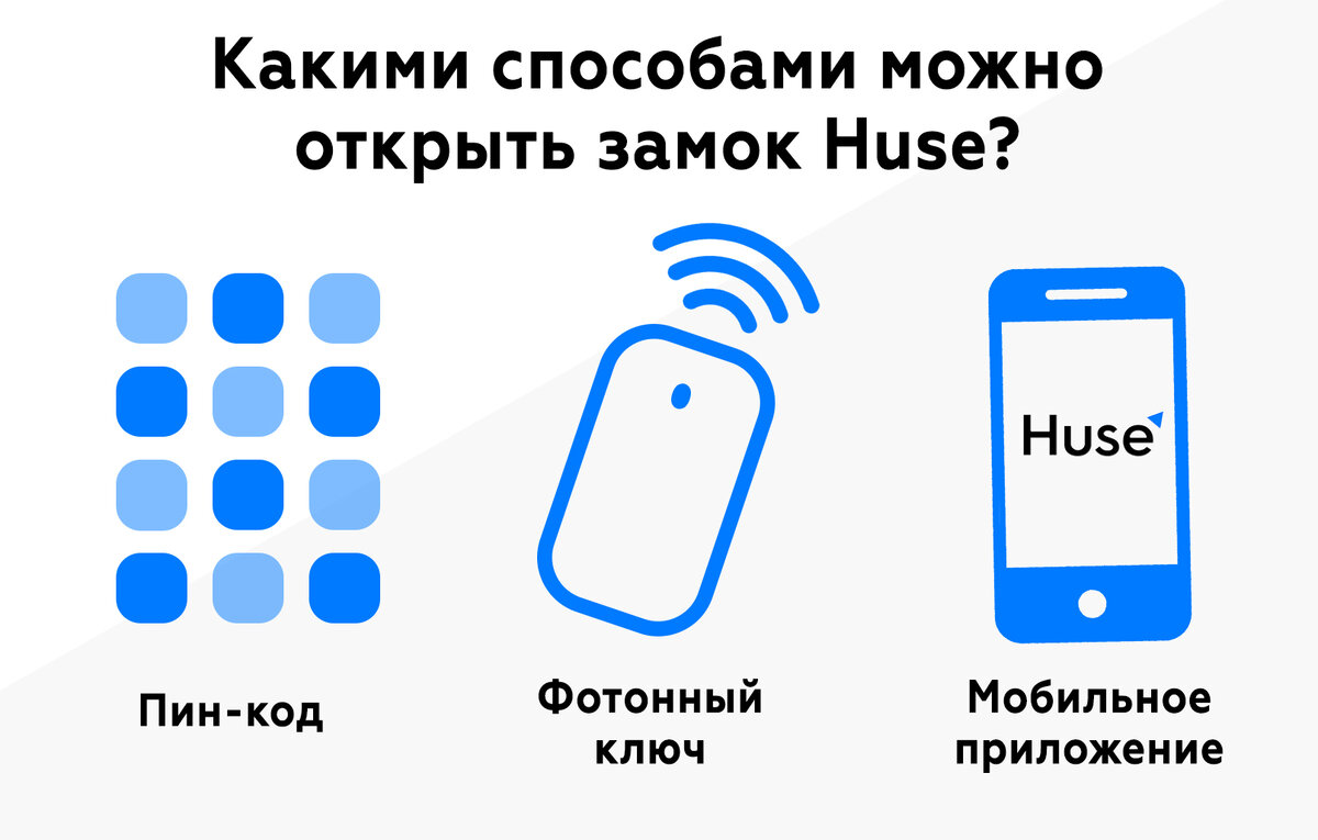Замок Huse имеет несколько способов отпирания. В зависимости от ситуации вы можете выбирать тот или иной удобный для вас способ. 1. Фотонный ключ. Основан на фотонных технологиях, которые позволяют пользователю с легкостью открывать дверь. Ключ используется на расстоянии 5-10 сантиметров от замка и не может быть перехвачен при его использовании. 2. Приложение в телефоне. Способ, который открывает дверь удаленно из любой точки мира. Это удобно, чтобы открыть дверь людям, которым вы доверяете: родственникам, друзьям или обслуживающему персоналу. 3. Пин-код. Если кто то из посторонних людей попытается подобрать код, дверь блокируется на некоторое время. Оформить предзаказ на устройство с 10% скидкой можно уже сейчас, на сайте: http://huselock.ru