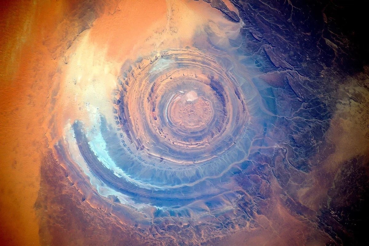 Это геологическое образование на территории Мавритании в Африке. Размер в диаметре достигает 50 км. Это место до сих пор покрыто тайнами и является одной из величайших загадок современности. Око сахары это древний геологический артефакт, который лежит в середине пустыни Мауро. Сначала космонавты использовали это место как ориентир, а любители экстрима на внедорожниках делали здесь свои соревнования. Ученые до сих пор спорят о его происхождении. Изначально выдвигалась версия, будто бы это кратер от огромного метеорита.