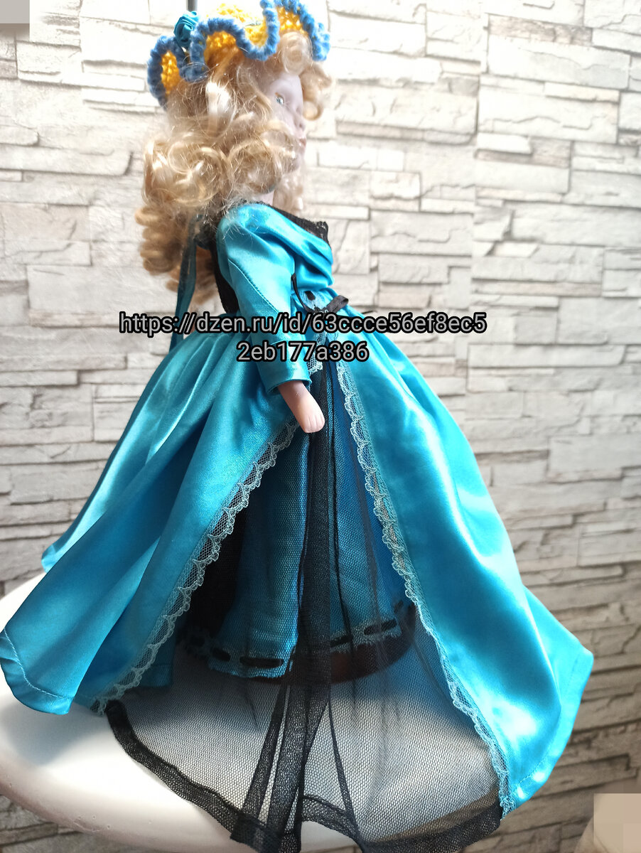 Жизнь живём, и в близком окружении конечно известно о наших умениях. Так ко мне и попала кукла на реставрацию. Требовалось пошить платье и придумать подставку, чтобы кукла оставалась интерьерным украшением. На родном фабричном держателе кукла заваливается. Дима изготовил круглую подставку, к которой и прикрутил фабричный держатель для полной устойчивости. Материал платья - лоскут от заказчицы. Итак, выкройки на бумаге я не делала, кроила сразу по ткани, впав в медитацию🤭. Детали сшивала на машинке, некоторые сметала, некоторые просто иголками сколола. И вот платье готово. Головной убор тоже просился моими глазами, так связалась шляпа жёлтого цвета, без всяких схем, просто взяла крючок, нитки(какие нашлись в шкафу) и начала вязать, украсила из остатков лоскута. Далее судьба куклы внесла свои коррективы. Т. к. заказчица из другого города, готовая кукла передавалась в данном случае через мою маму, которая подметила, что жёлтая шляпка маловата, и связала свой вариант: шляпу голубую, ш