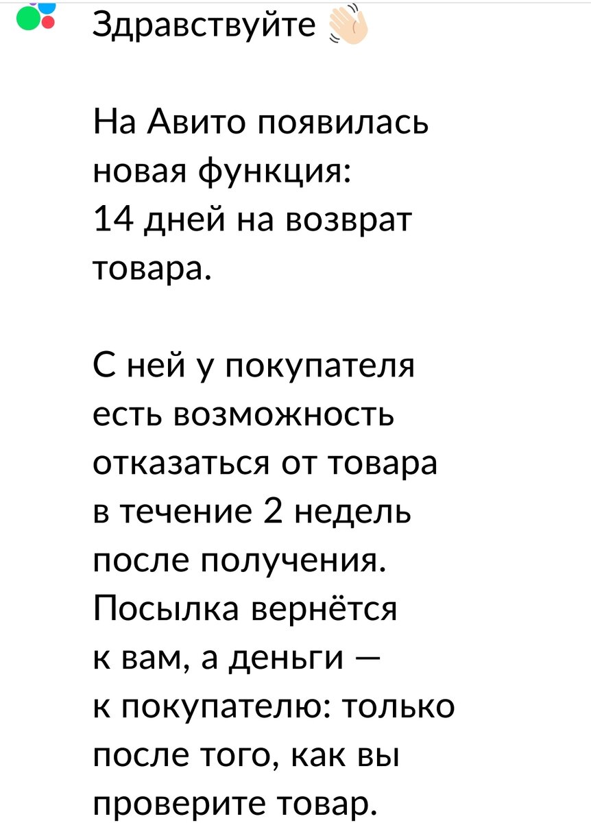 Ну или это я такая непонятливая. Пришло мне вчера письмо счастья) И, как в сказке: "Всё бы хорошо, да что-то нехорошо". Как будет выглядеть возврат в деле? Купили, значит, у меня пиджак новенький. Есть у меня такой в профиле если что. И вот забрали его, а через неделю разонравился он. Решили его вернуть. Кто проверит: носили ли его, или нет? Сотрудник почты — как написано в разъяснениях. Бедные сотрудники почты, их уже и экспертами сделали. Только когда им этим заниматься, да с каким оборудованием-то... Положим, что честный покупатель оказался. Не носил. Неделю продержал пиджачок с карманами и понял: не моё, вертай в зад. Принес на почту, отправил, ну а я с радостью пиджак забрала обратно. И деньги вернула, естественно. А тут вопрос по деньгам. Когда покупатель забрал вещь я имею право пользоваться ими? И вообще они поступают на счёт продавца? Или они будут заморожены на 14 дней? А если нет — вдруг я их потрачу и не окажется у меня нужной суммы? Написано, что возврат товара пока бесп
