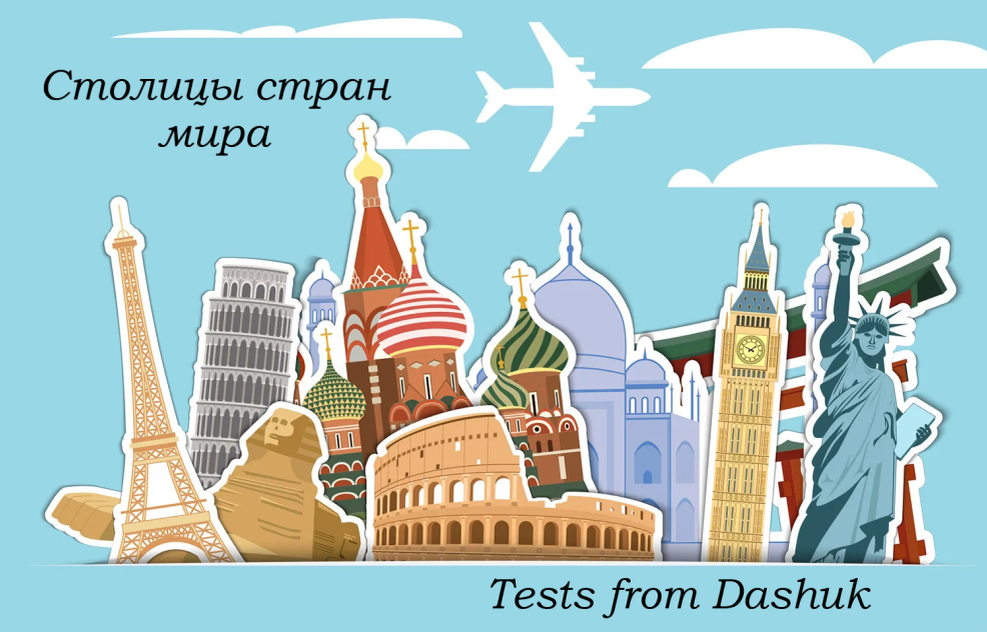 В этом тесте, как вы уже поняли, 10 вопросов. Все страны, то есть и их столицы, с разных континентов - не определенный материк. Результат, как всегда, сразу после прохождения теста! Желаю удачи! by Dashuk
