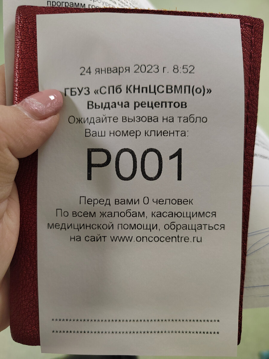 Добрый вечер! 24.01 врач пройден, следующий этап - контроль КТ с контрастом и 22.02 опять к нему. У меня есть выбор - ехать в Песочку или делать КТ в районном онкодиспансере. Так как КТ после операции, на которой мне все вырезали, то без разницы где делать, сравнивать ни с чем не будут. Хорошо, в пятницу еду к районному онкологу, попрошу дать направление на КТ с контрастом. Про побочки которые у меня есть и были так врач и сказал, что классические, прямо по инструкции. Все делаю верно. Лейкоциты не критичны, кровь хорошая. Вывод: пить дальше лекарство. Написал мне назначение и отправил за рецептом бесплатным в другое отделение. Сегодня аншлага не было, мы были первые к рецептурному окну. Бумажки мои взяли на оформление рецепта, а потом вызывали и отправили опять к врачу за рецептом, который он должен оформить от руки сам. При этом в рецептурном сказали странную фразу, типа: сейчас этот препарат не всем положен (не помню дословно). Прошлый раз мне они сами писали рецепт и ни
