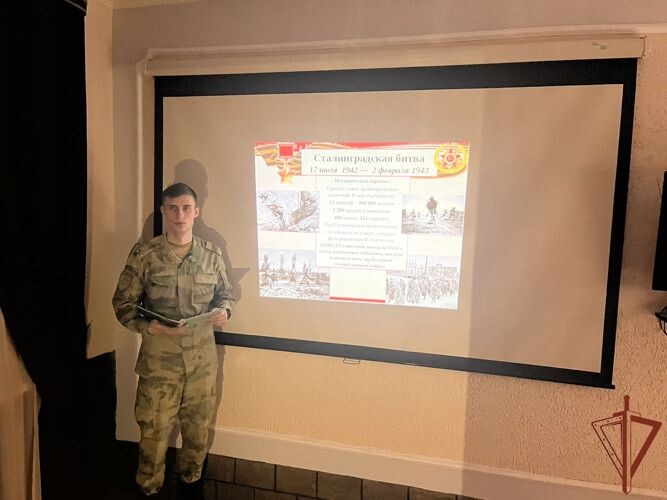 В рамках ведомственной акции «Росгвардия. Страницы Победы: Сталинград» военнослужащие и сотрудники Сибирского округа войск национальной гвардии Российской Федерации проводят патриотические уроки с подрастающим поколением, а также становятся участниками образовательных проектов. В Томской области лейтенант Виктор Гетманский провел урок истории для 10 класса северского кадетского корпуса. Офицер Росгвардии рассказал ребятам об особом значении Сталинградской битвы в достижении Победы в Великой Отечественной войне, подвигах 10-й стрелковой дивизии войск НКВД в сражениях за оборону Сталинграда и продемонстрировал фильм «56 огненных дней» киностудии ведомства. В завершение встречи представитель Росгвардии пожелал кадетам изучать историю Отечества, хранить и беречь память о Великой Победе. В Кемеровской области сотрудники вневедомственной охраны Росгвардии посетили прокопьевскую библиотеку №6 и приняли участие в патриотическом мероприятии «Сталинград. Коренной перелом. Открытое сражение». Орг